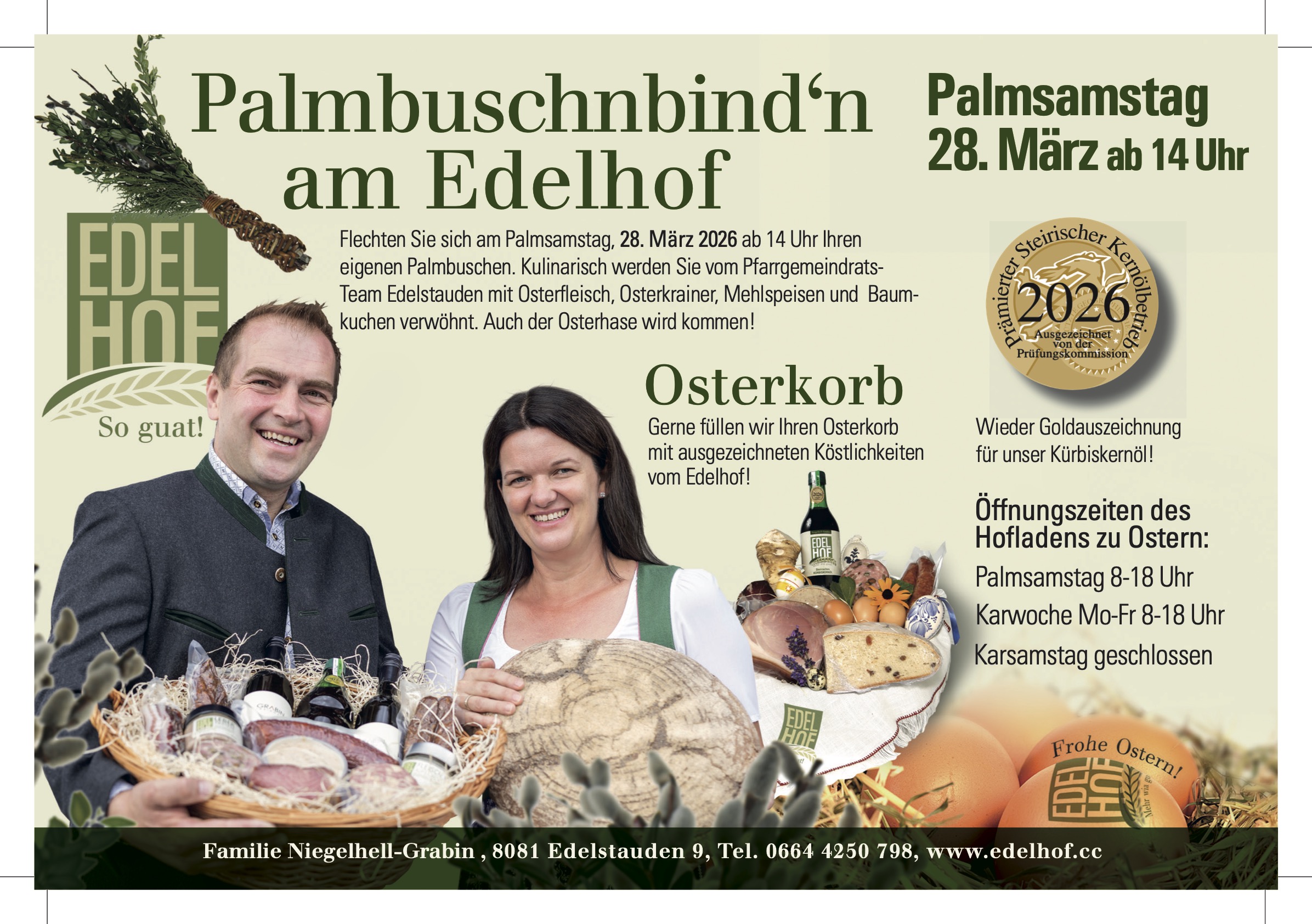 „Edelhof“ ist eine Eigenmarke der Familie Niegehell- Grabin in Edelstauden – südöstlich von Graz. Seit Jahrzehnten wird am Hofe der Familie Niegelhell schon Gutes erzeugt und veredelt. Verkauft wurden diese Produkte hauptsächlich am „Kaiser-Josef- Markt“ in Graz. Die gute Resonanz der Kunden am Markt bewog uns, immer mehr Produkte zu erzeugen und anzubieten. In der Landwirtschaft und in der Veredelung wird von allen Familienmitglieder fleißig zusammen geholfen. Seit einigen Jahren ist Schwiegersohn Josef am Hof und leitet mit Andrea den Betrieb. Im März 2012 wurde die neue Betriebsstätte und der Hofladen eröffnet.